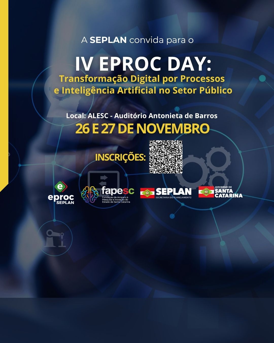 A Secretaria de Estado do Planejamento de Santa Catarina (SEPLAN), por meio do Escritório de Gestão de Processos (EPROC), promoverá o EPROC DAY: Transformação Digital por Processos e Inteligência Artificial no Setor Público, nos dias 26 e 27 novembro de 2025, das 13h às 19h.