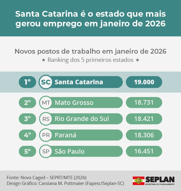 O mercado de trabalho em Santa Catarina se destaca no cenário nacional, com o maior saldo de novas vagas de empregos formais em janeiro de 2026. Com o saldo de 19.000 novos postos, o estado foi seguido pelos estados do Mato Grosso (18.731), Rio Grande do Sul (18.421), Paraná (18.306) e São Paulo (16.451), estados com alto quantitativo populacional.
